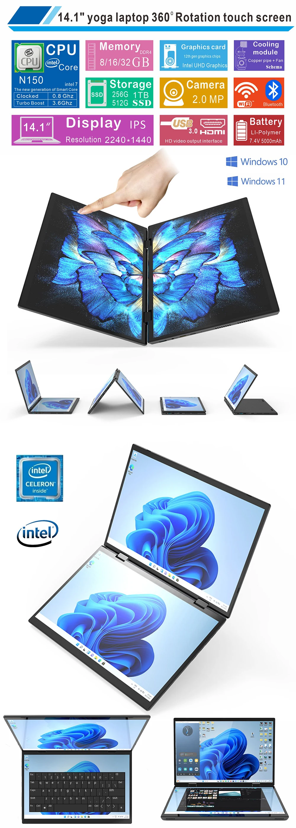 2026 New 14 Inch +14 Inch Dual Touch Screen Intel 14th N150 Aluminum Yoga Laptops for Business Office Education Laptop